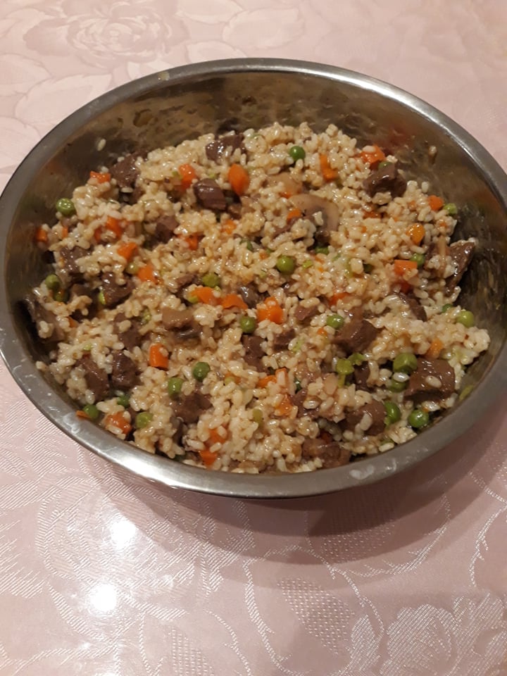 rizoto - varím osobitne mäso a ryžu. Ryžu klasicky spolu s mrkvou a hráškom, dnes som pridala aj šampiňóny v konzerve. Mäso - v tlakovom hrnci popražím cibuľu na oleji, pridám červenú sladkú papriku, mäso, krátko podusím kým sa nezatiahne podlejem vodou, ochutím mletou rascou, korením, grilovacím korením, vegetou a dusím do mäkka. Hotové scedím a zmiešam s ryžou, postupne pridávam šťavu z mäsa. Niekedy si odložím aj na druhý deň a keď zohrievam pridá si každý podľa toho aké šťavnaté rizoto chce.