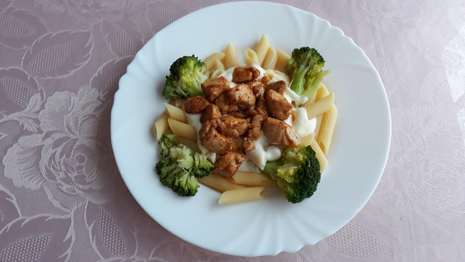 penne, grilované kuracie kúsky, brokolica, syrová omáčka