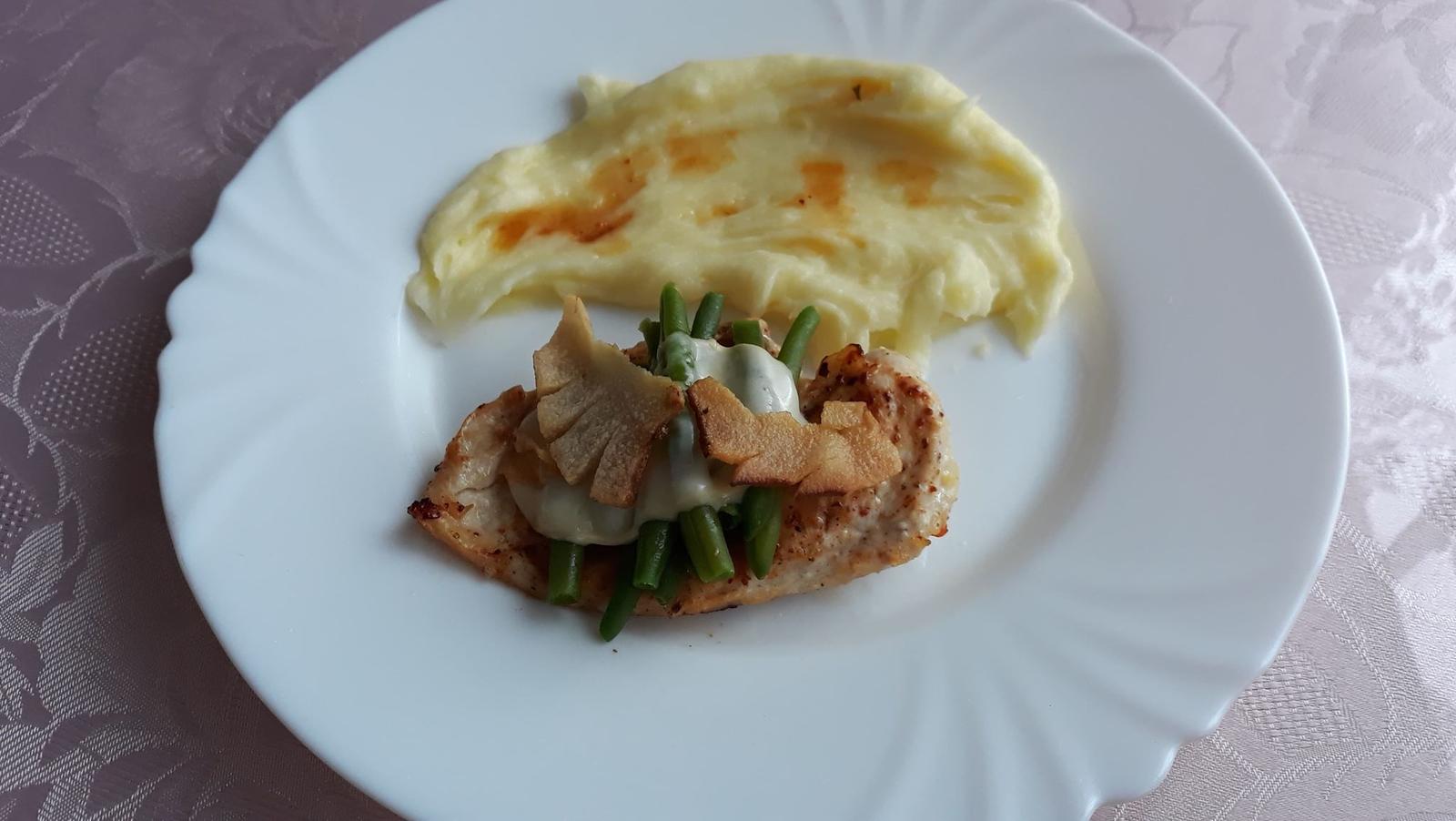 kurací rezeň so zapečenou fazuľkou, syrom a slaninkou, zemiaková kaša