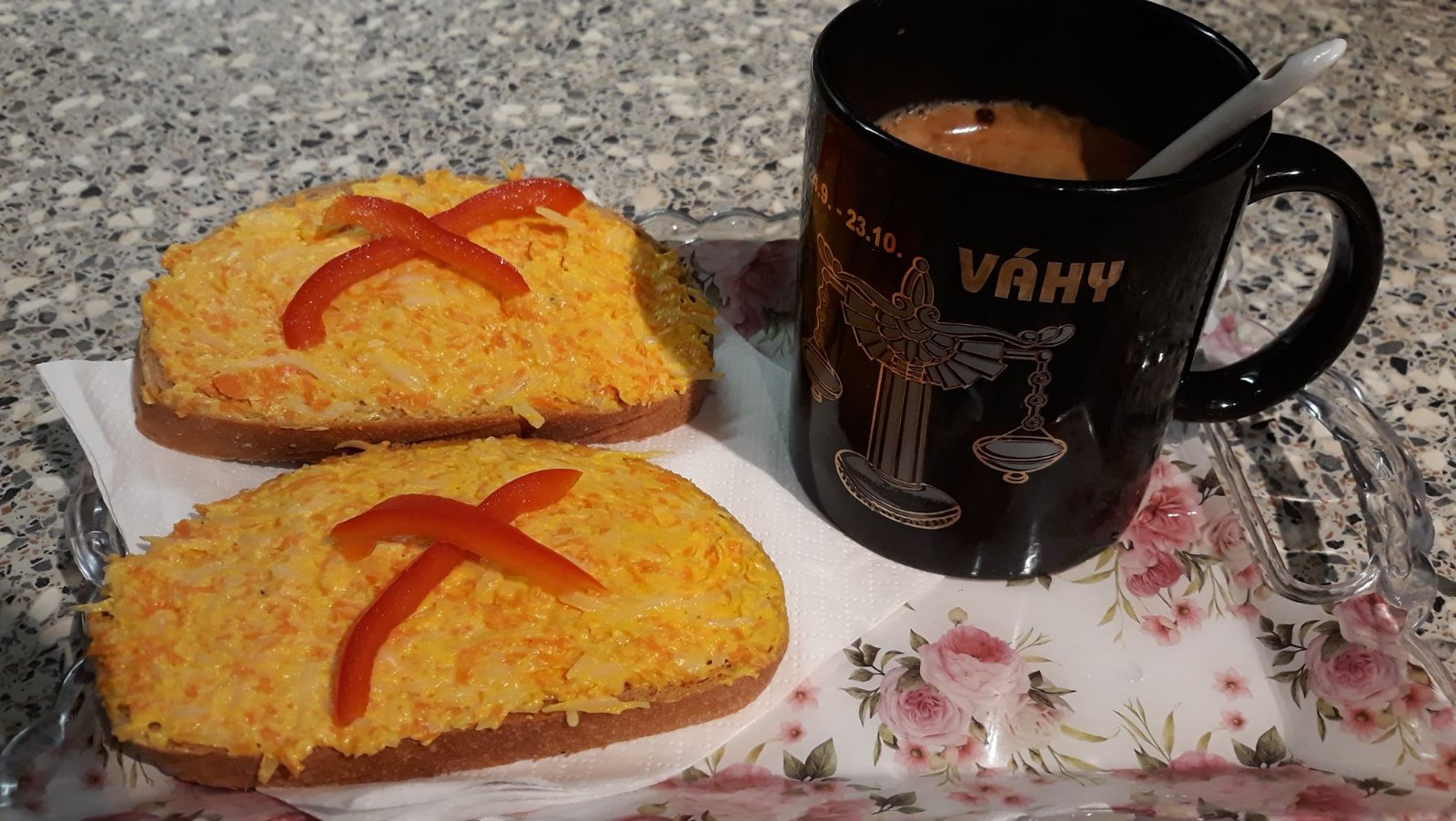 Chlebík s mrkvovou pomazánkou, kávička☕️