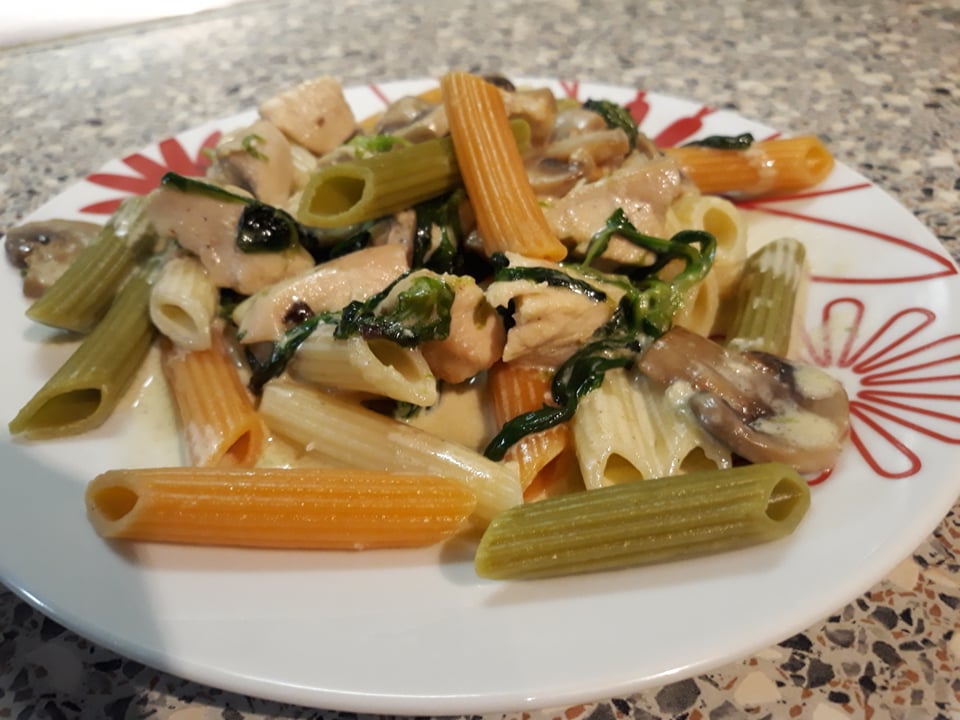 Penne s kuracím mäskom v smotanovej omáčke so šampiňónmi a čerstvým špenátom