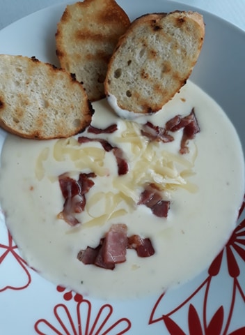 Syrovocesnaková krémová polievka so slaninkou a bagetkami