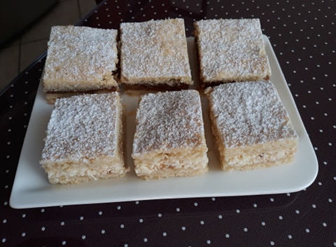 Recept : 600g polohrubej múky, 15 dkg práškového cukru, 30 dkg margarínu,2 vajcia, 2 dkg droždia, 1 ČL prášku do pečiva. Všetko spolu rukou zhnetieme na kompaktné cesto (droždie len rozmrvíme medzi prstami) a rozdelíme ho na 2 polovice. Plech vystelieme papierom na pečenie alebo vymastíme margarínom a dáme jednu časť rozvaľkaného cesta, navrstvíme jablká a prikryjeme druhou rozvaľkanou časťou, Povrch popicháme vidličkou. Pečieme na 180 asi 25-30 minút doružova. Hotové pocukrujeme práškovým cukrom. Plnka : 1 kg očistených nastrúhaných jablk ochutených škoricovým, vanilkovým a kryštálovým cukrom. Plnka môže byť aj tvarohová - hrudkovitý tvaroh 500g, 2 žltky, štipku soli, vanilkový cukor, kryštálový cukor podľa chuti.