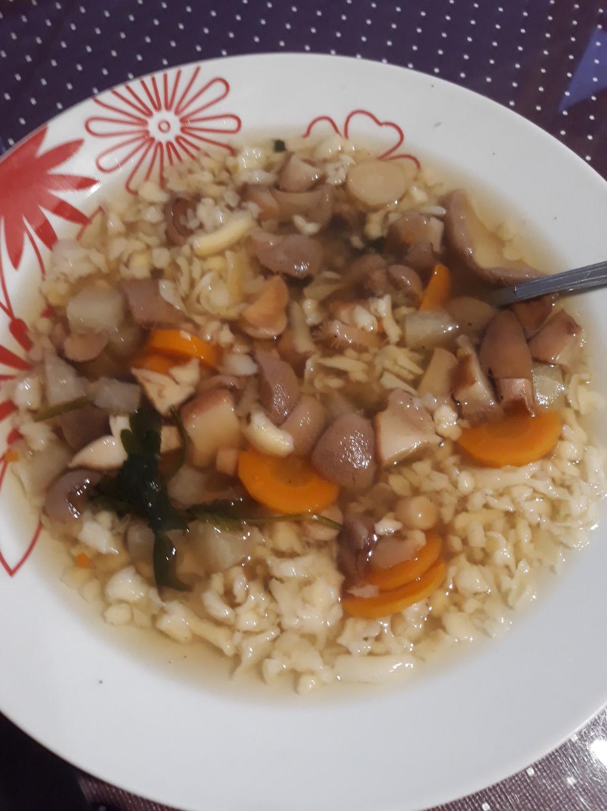 autor@lenushka27 umyté nakrájané huby na menšie kocky dám variť do vody, pridám mrkvu, petržlen, petržlenovú vňať, ochutím vegetou, soľou, korením. Varím v tlakovom hrnci cca 25 minút. Do hotovej polievky niekedy dávam zápražku - 2 PL hladkej múky, 2 PL masla spolu na panvici popražím, prisypem mletú červenú papriku, premiešam, zalejem studenou vodou a chvíľku povarím. Hotovú zápražku precedím cez sitko do polievky a nechám spolu prevrieť 2-3minútky. Do tejto polievky na fotke som zápražku nerobila.