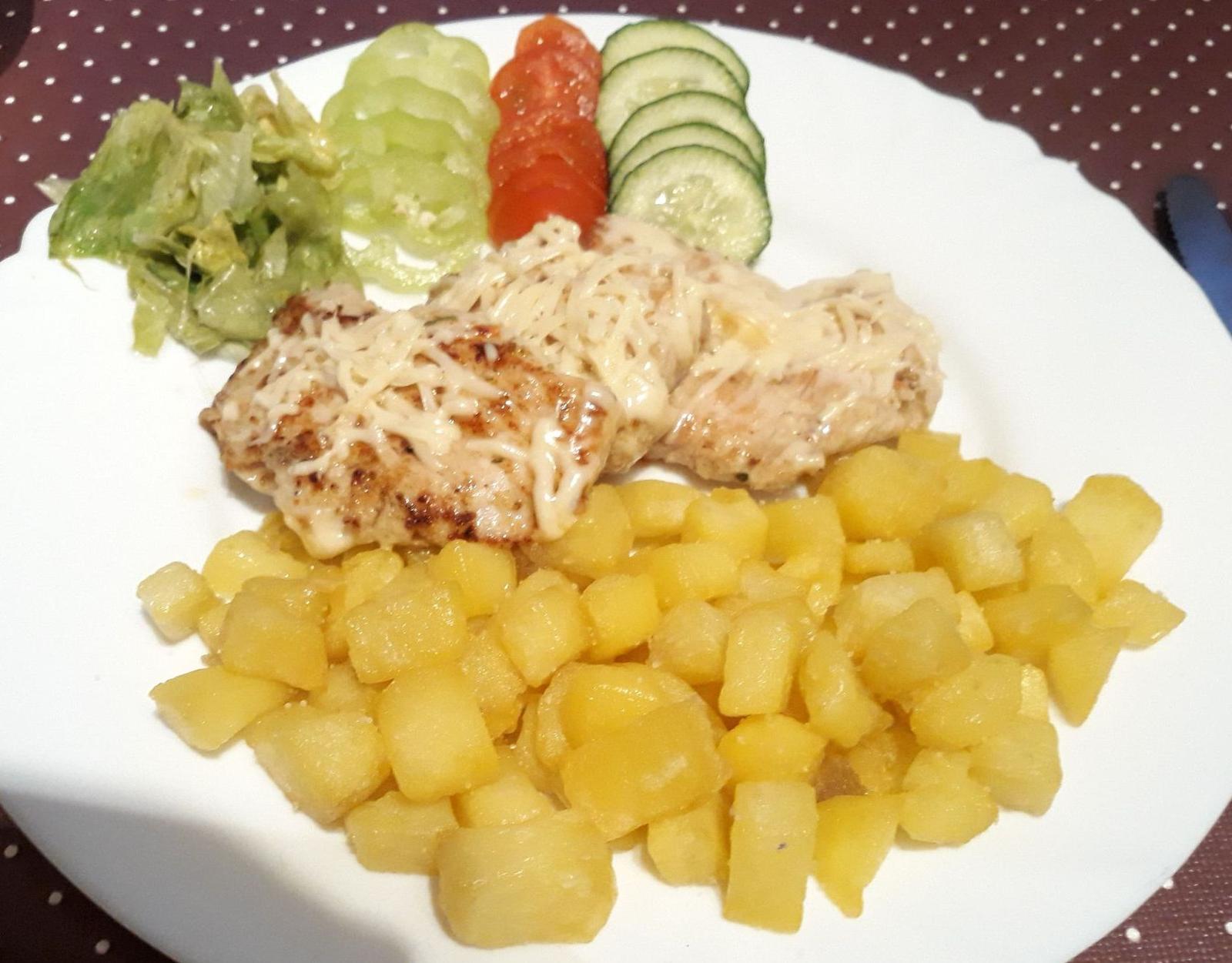 morčacie prsia som na hodinku dala do pácu: olivový olej, mletá rasca, čierne korenie, sušený cesnak, vegeta, soľ - potom som ich opiekla na grilovacej panvici, cca 5 min z každej strany ( záleží na hrúbke mäska) a navrch nastrúhala syr