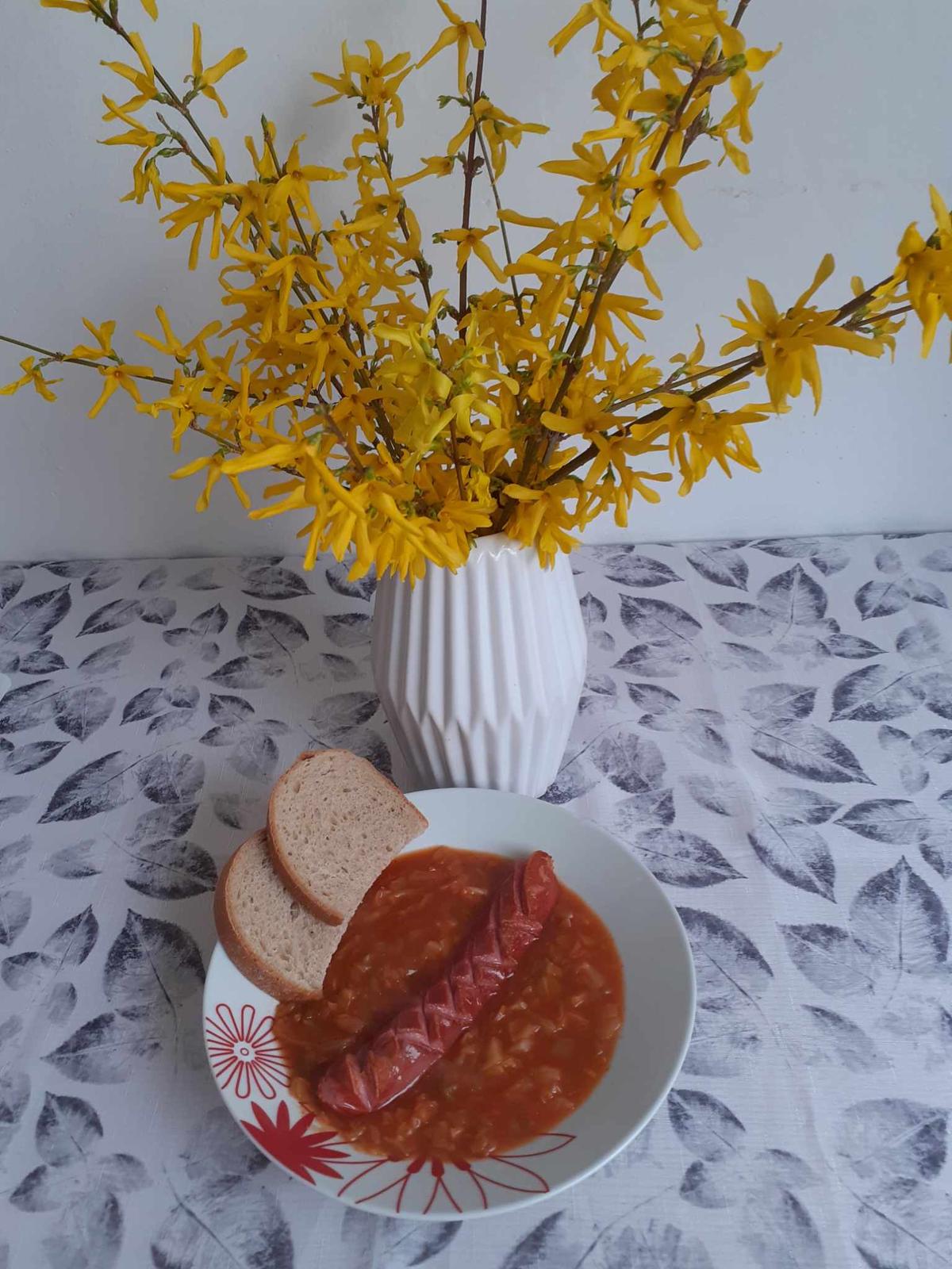 Paradajková kapusta,opečená párková klobáska, chlebík. Jogurtový koláčik s ovocím a čokoládou