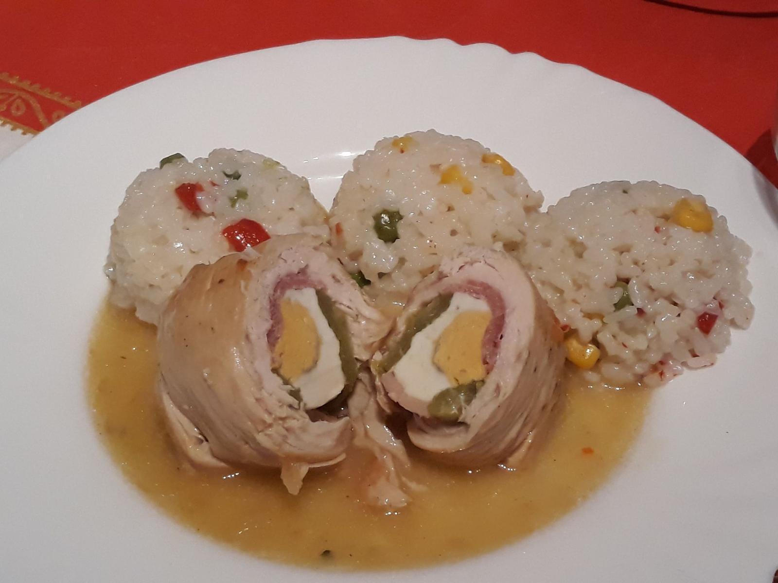 Závitky z morčacích pŕs plnené vajíčkom, slaninkou, uhorkou, zeleninová ryža🎄