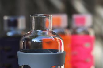 Sklenenné fľaše v silikonovom obale. Veľmi dobre sa umývajú, príjemné na nosenie a používanie.