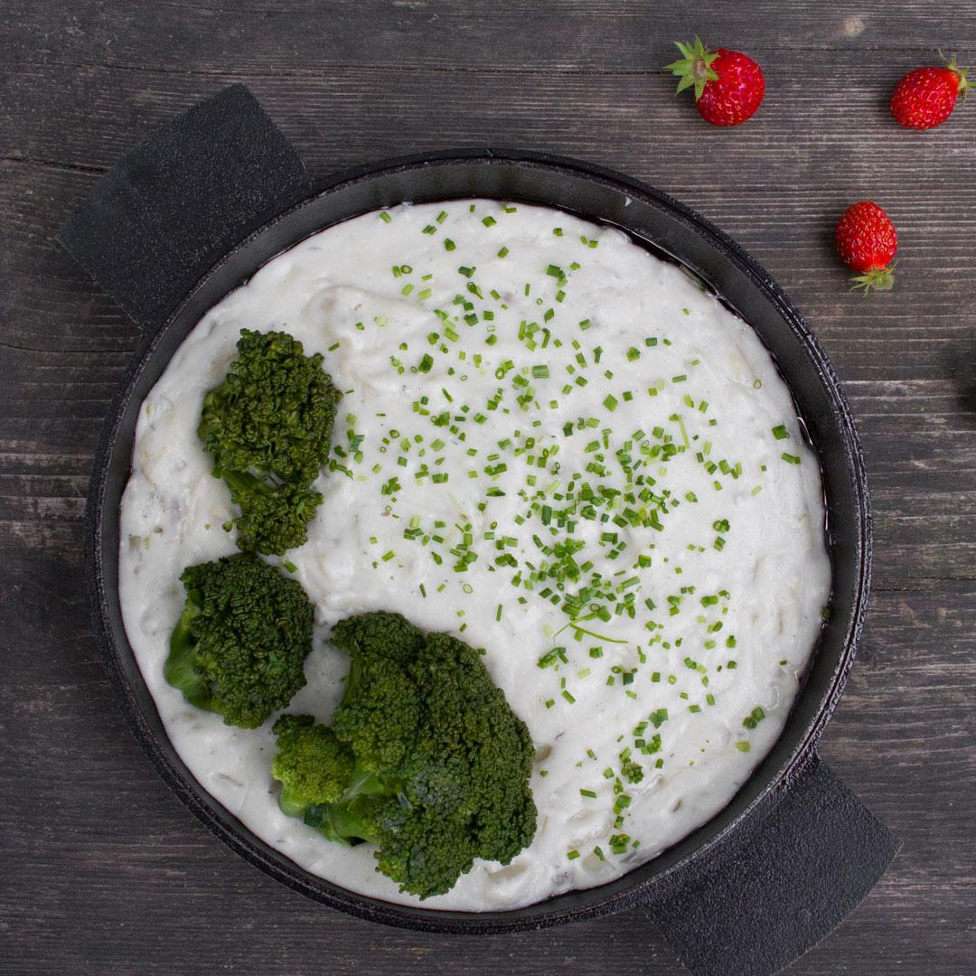 na večeru syrová omáčka s pažitkou a uvarená brokolica