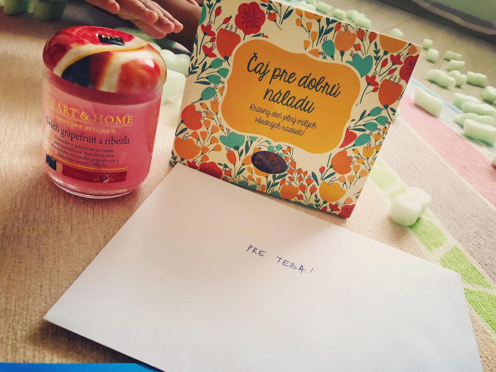 V balíčku k nám dorazila veľká kreatívna sada farbičiek, fixiek a pasteliek. Čarovná omaľovánka a pre mňa sviečka a čajík s listom (milo ma to prekvapilo).