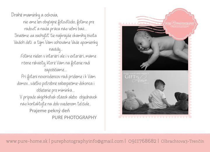 Fotenie bábätiek nie je pre nás len prácou, vždy sme poctení, keď si nás klienti vyberú, aby sme zvečnili prvé dni života ich človiečikov … Detičky vyžarujú neskutočne dobrú energiu, ktorá Vás ženie v pred.., preto je naša práca tou najúžasnejšou na svete. Ku každému miminku pristupujeme individuálne, necháme mamičku v kľude počas fotenia nakojiť bábätko, prebaliť, pomôžeme ho uspinkať... Ak niektoré mamičky majú pocit, že ich bábätko nezvládne fotenie v ateliéri, radi prídeme k nim domov a odfotíme bábätko u nich doma.