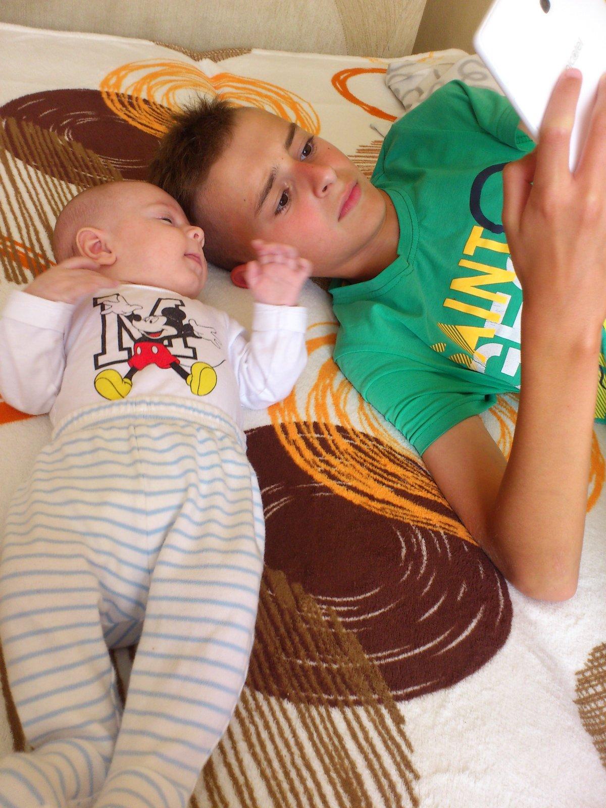 Mikinko a Tonko pozerajú niečo zaujímavé na tablete📱