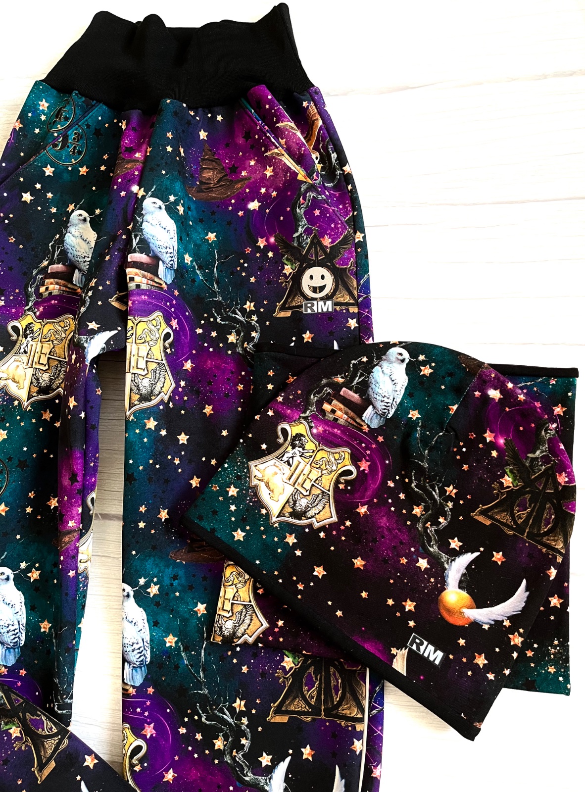 Krásny vzor Harry Potter opäť naskladnený a hneď aj vznikla na želanie táto súpravička celovzorovaných softshellových nohavíc (128) a čiapky s nákrčníkom 💜🖤🪄🧙♂️