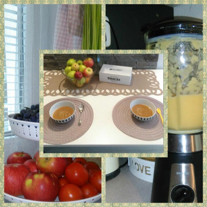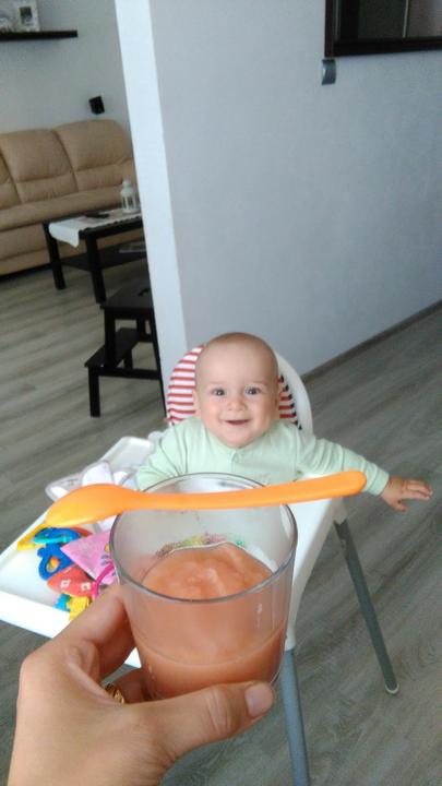 Naše deti sú dnes hore UŽ od 5 😖😨 tak majú za sebou už aj desiatu👍 jablkové pyré👶👧