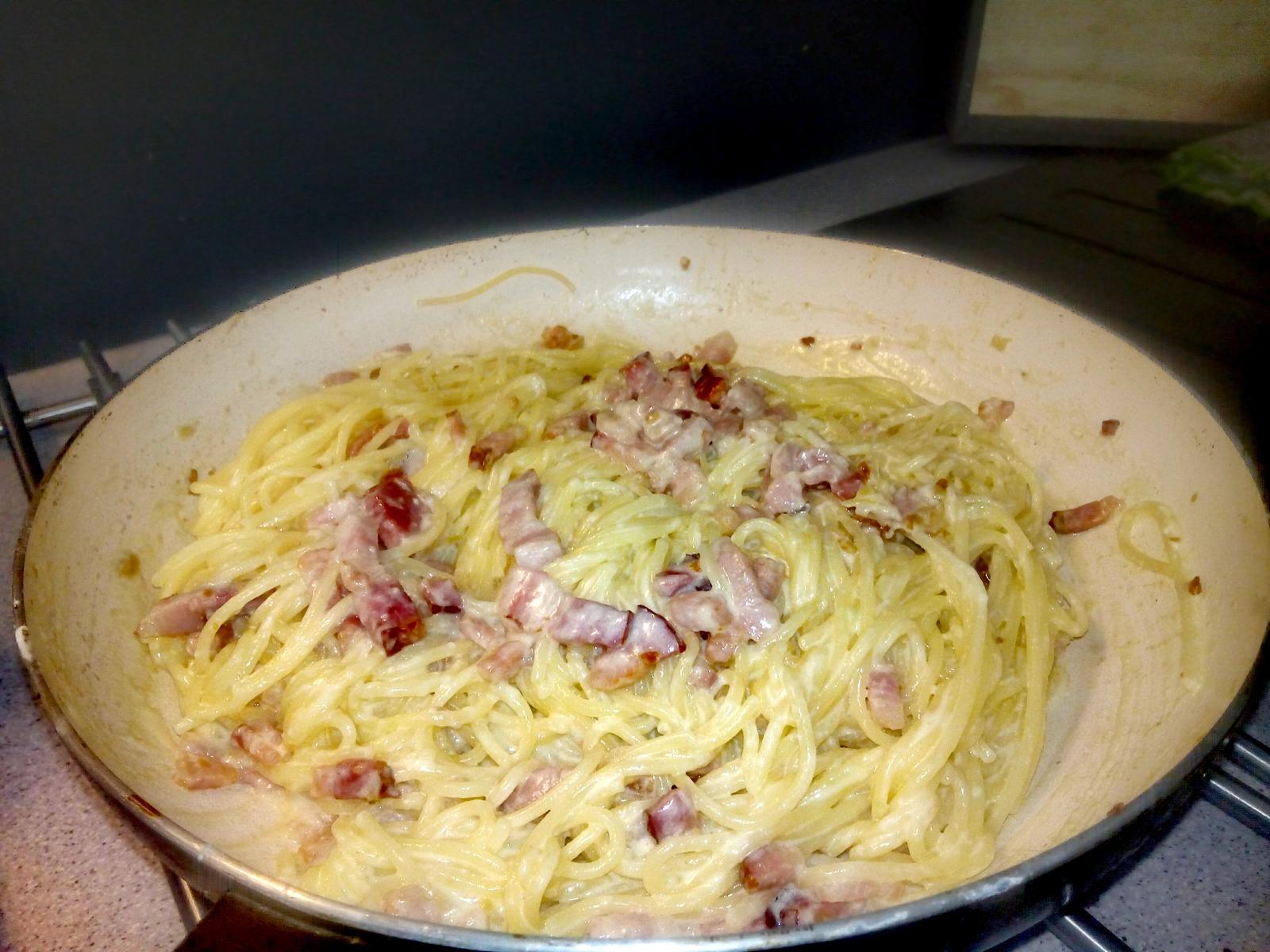 Na panvici si opražíme cesnak a slaninku. Vajco, smotanu a nastrúhaný parmezán si v miske vymiešame. Cestoviny zlejeme, primiešame olivový olej a pridáme na panvicu k slaninke ( trochu vriacej vody si nechajte pre prípad, že by to bolo nedostatočne horúce). Zoberiemez ohňa a ešte na horúcu panvicu prilejeme smotanovú omáčku. Miešame miešame a vajíčka sa nám spravia na horúcich špagetách. Podľa potreby prilejeme vodu a podľa chuti osolíme a okoreníme.