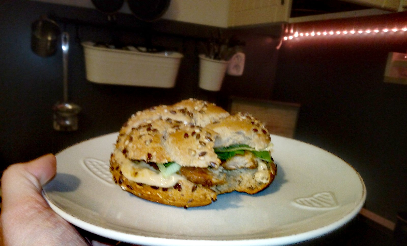 Opečené kuracie prsia, plnotučná horčica BILLA a listy špenátu BILLA fresh v celozrnnej žemle 👌Bez tej hryzky to vraj nešlo 😂🙈