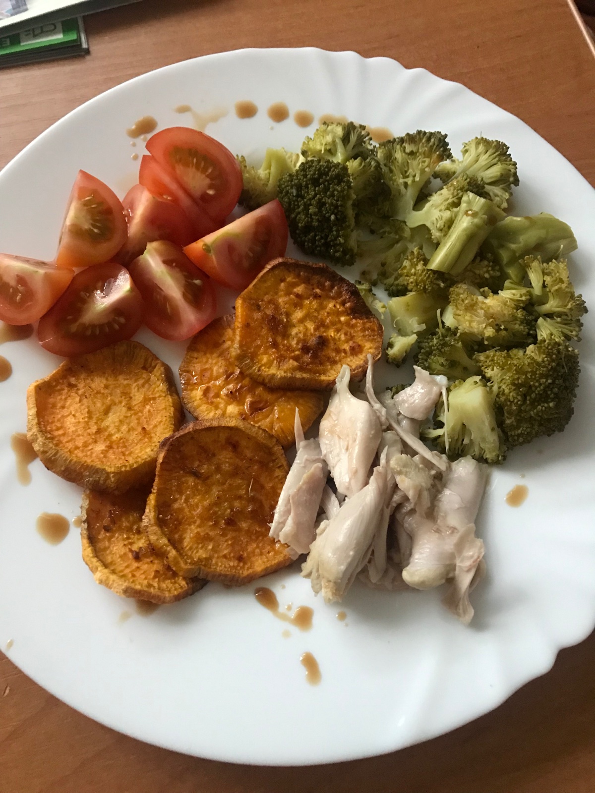 Pečeny Batat, uvarene kuracie masko a zelenina