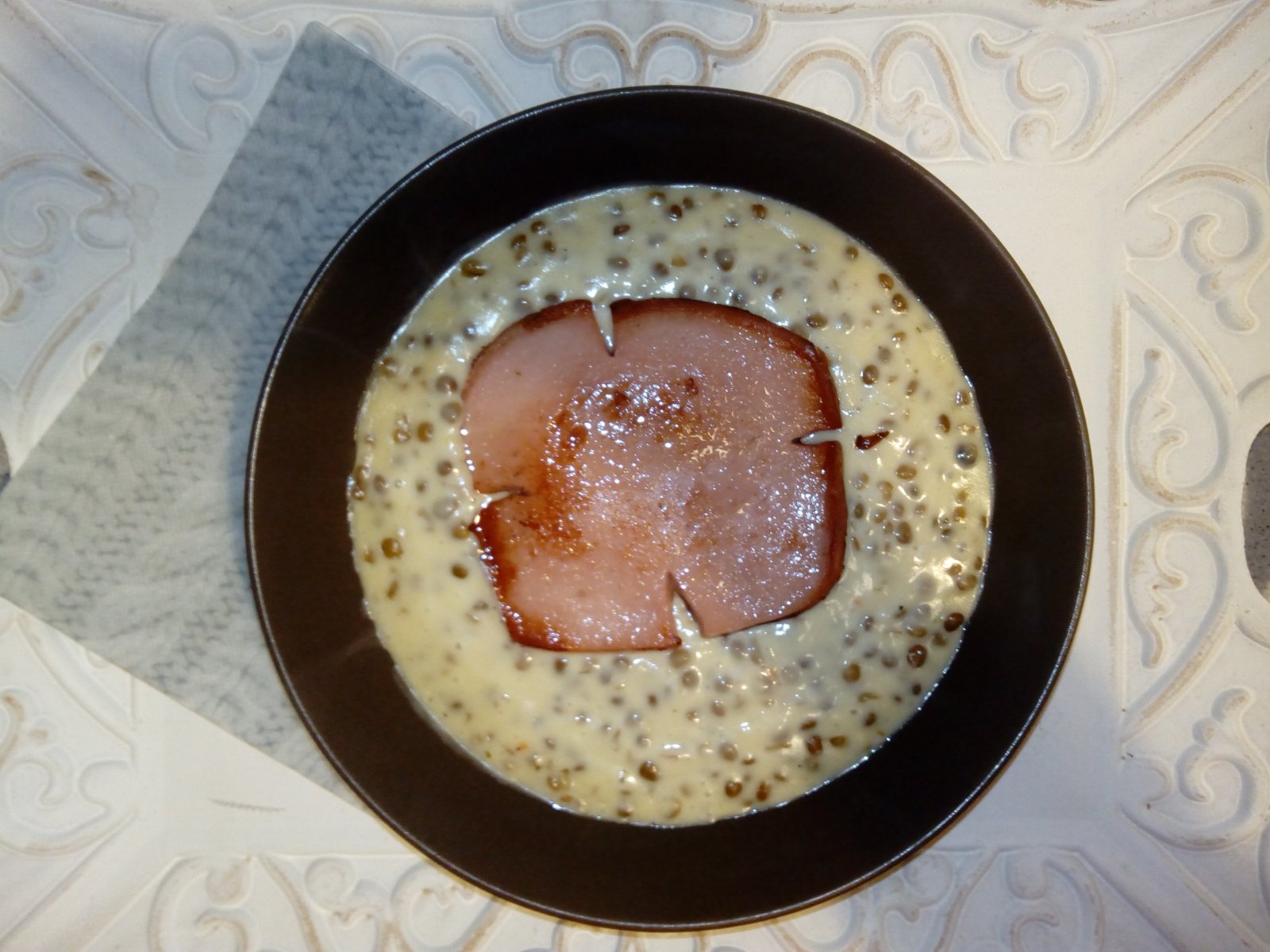 Fazulova polievka, pecienka na kecupe s ryzou, sampionovo-slaninkovo-smotanove cestoviny 😉Dojedli sme co nam zostalo