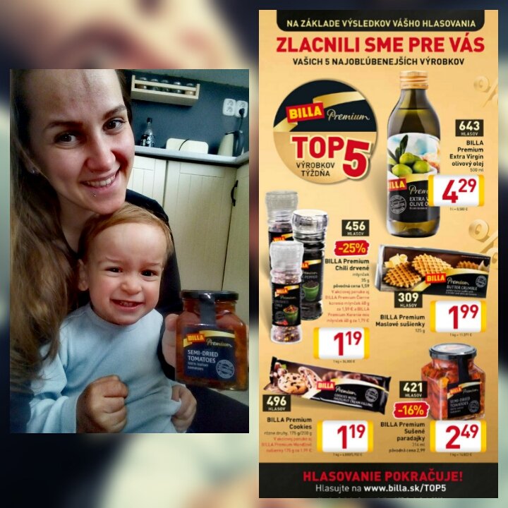 Vďaka vášmu - nášmu hlasovaniu v TOP 5-ke sme si kúpili BILLA Premium sušené paradajky 🍅 za zvýhodnenú cenu 👌💛
