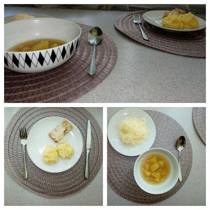 Takže dnešné menü je cesnáková polievka a rybka so zemiakovou kašou 👌