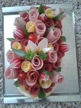 Na tácku poukladáme sendvičové chlebíky, natrieme napr. vajíčkovou pomazánkou, naukladáme šunku,plátky syra, potom opäť nátierka, opäť chlebík, potom dáme druhú nátierku napr. klobáskovú, opäť chlebík, potom opäť vajíčková, šunka a nakoniec chlebík. Celú tortu potrieme vajíčkovou nátierkou, naukladáme na celú tortu šunku, potom vytláčacím syrom nalepíme na šunku syr, čiže celá torta bude obalená plátkami syru. Celú tortu zabalíme do potravinovaj fólie a dáme do chladničky. Na druhý deň zdobíme pred pripravenými ružičkami zo šunky, syra, stonky kvietkov môžu byť z cibule alebo uhorky, listy z kučeravého šalátu,z uhorky a papriky a ako dekoráciu cheri rajčinky , šunkové ružičky a ružičky s dvoch druhov salámi.