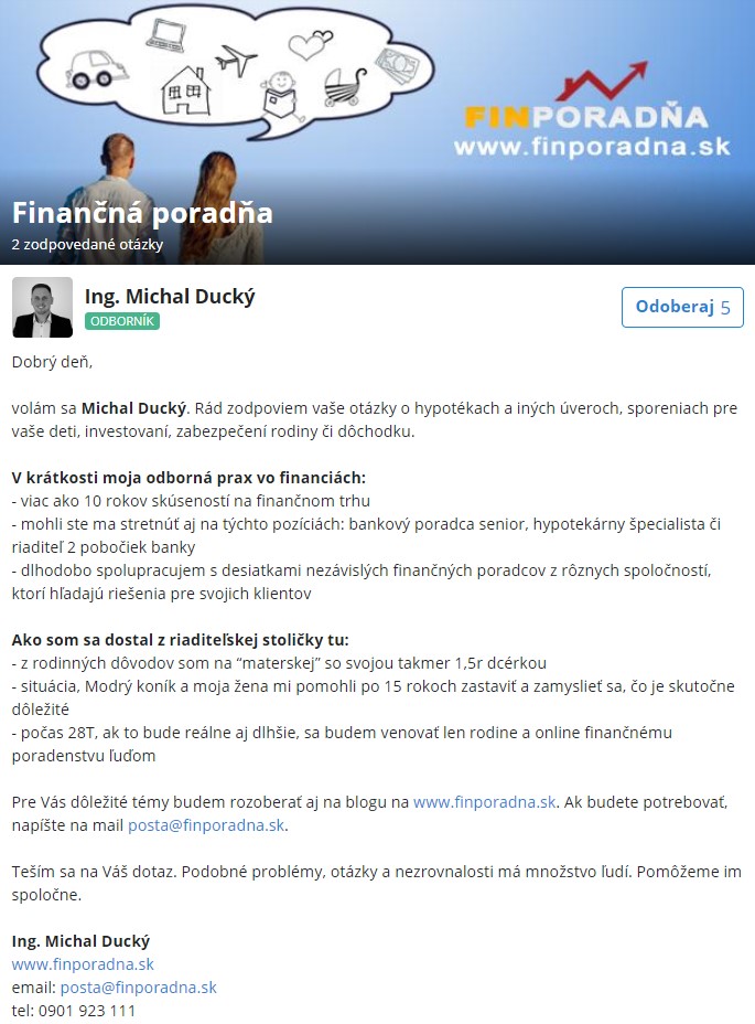 Od dnešného dňa vám na vaše otázky o hypotékach a iných úveroch, sporeniach pre vaše deti, investovaní, zabezpečení rodiny či dôchodku odpovie v koníkovskej poradni Ing. Michal Ducký, ktorý vymenil riaditeľskú stoličku za materskú dovolenku, počas ktorej bude pôsobiť ako online finančný poradca.