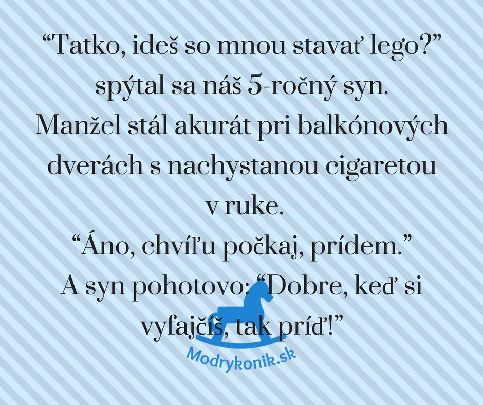 Mnažel volal minule malého von a pred odchodom z bytu mu malí pohotovo zahlási vo dverách,, počkaj musím skontrolovať či mám všetko mobil penaženku cigarety dobre možeme ísť mam všetko ,, manžel pozrel na neho na mna a nevedel či sa má smiať či mu vynadať