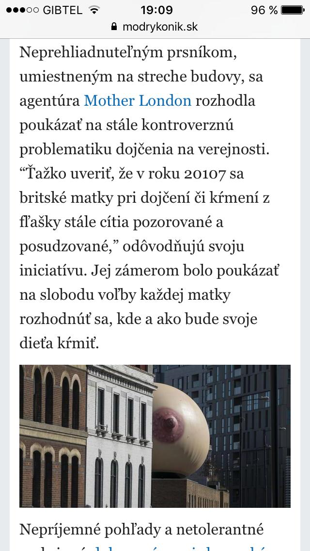 V Londýne sa dojčiace matky dočkali doslova obrovskej podpory. Neprehliadnuteľným prsníkom, umiestneným na streche budovy, sa agentúra Mother London rozhodla poukázať na stále kontroverznú problematiku dojčenia na verejnosti. “Ťažko uveriť, že v roku 20107 sa britské matky pri dojčení či kŕmení z fľašky stále cítia pozorované a posudzované,” odôvodňujú svoju iniciatívu. Jej zámerom bolo poukázať na slobodu voľby každej matky rozhodnúť sa, kde a ako bude svoje dieťa kŕmiť.