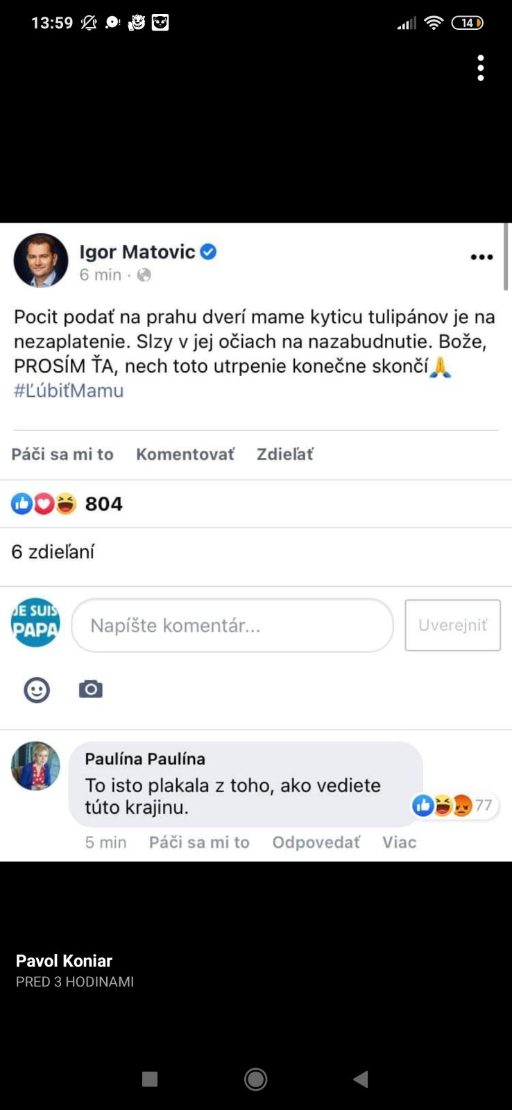 @reenie inak ako to je? Ja mu komentovat nemôžem prečo? A mna vcera dostal status o kvetoch, ktoré odniesol mame. Jedna pani tam napisala ze super, ze aj ona by chcela rodicom ale od leta ich nevidela. A jeho "ludia" sa do nej pustili, ze co je to za dcéru, ze nejde pozriet svojich rodičov ... normálne som nechapala a viem ako sa cíti, ja som svojich rodičov nevidela pol roka ... cele zle toto. A naozaj nechápem ako ho este niektori ludia zboznuju a velebia ...