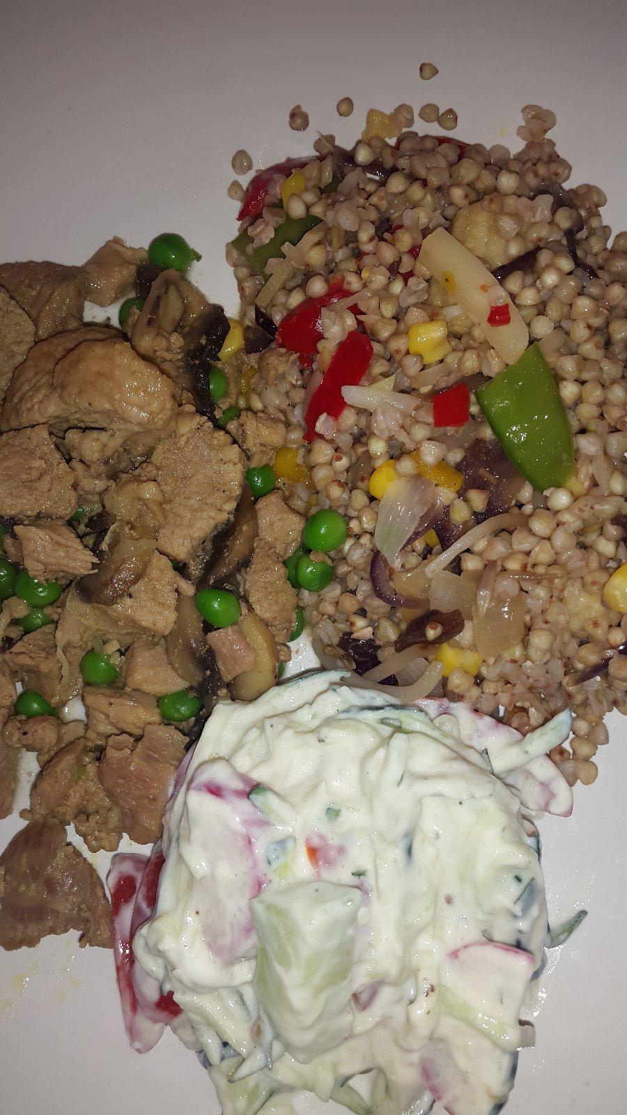 morcacie stehno s hraskom a hubami,pohanka so zeleninou.Priloha sviezi salat-cuketa,paradajka,uhorka,parmezan,jogurt