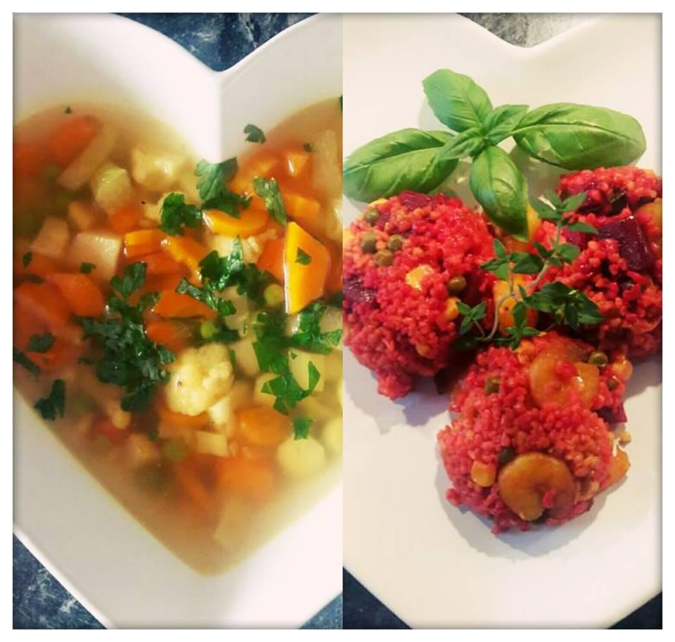 zeleninova polievka,cviklovy bulgur s krevetamy :-)