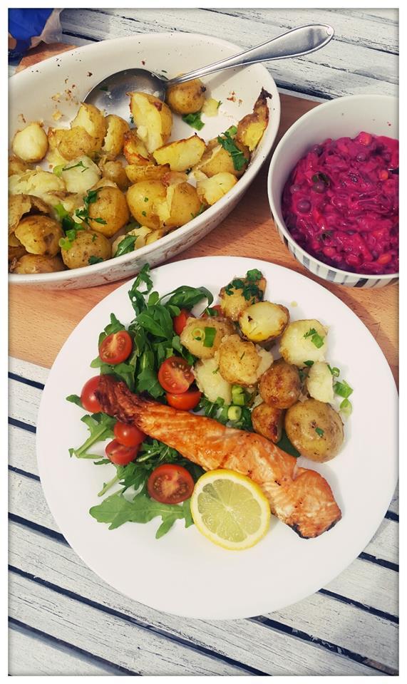 BBQ today.Losos,zemiaky,cviklovy salat(cvikla,hrasok,kukurica,cibulka,Alpro jogurt)