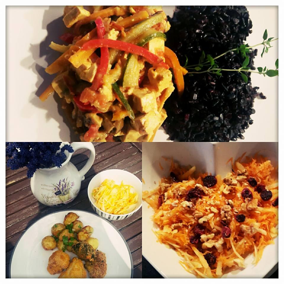 čierna ryža, tofu na zelenine,Karfiol, brokolica,zemiaky -všetko pečené v rúre,mrkva, jablko, med, orechy, brusnice, goji,citron