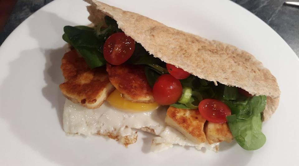 Celozrnná pitta, pikantné Halloumi, volské oko, zelenina. Mňamka 👍