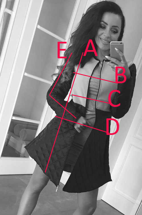 A-celková dlžka 90cm,B-širka pod pazuchami 48x2cm,C-šírka cez pás 43x2cm,D-šírka cez bedrá 47x2cm,E-dlžka rukáva 63cm