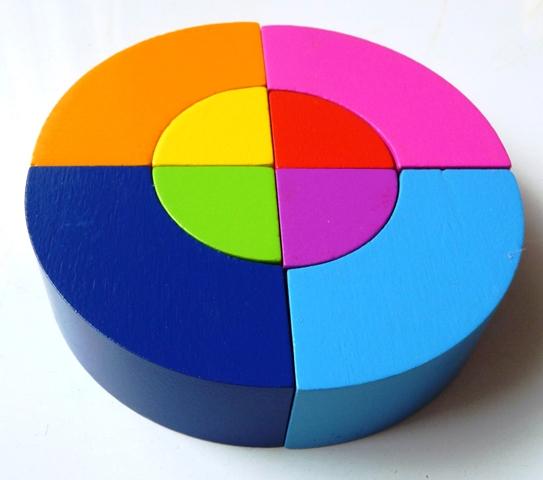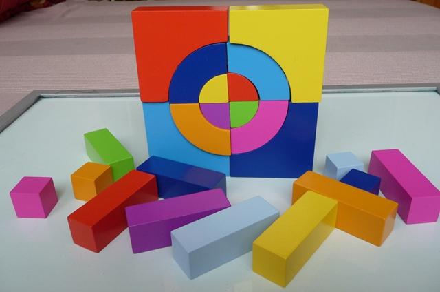 Drevené kocky a hlavolam v jednom pre deti od 2 rokov. Vďaka štvrťkruhovým tvarom sa dá postaviť aj 3D kocka, e-shop rozumnehracky.sk