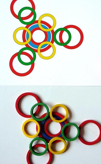 Drevené kruhy 60ks, obojstranné predlohy 24 ks - na spoznávanie farieb, čo je menší kruh, čo je väčší kruh, čo je vpredu, vzadu, čo je nad, pod,rozumnehracky.sk