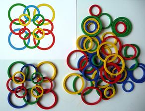 60 ks drevených kruhov, 24 obojstranných predlôh. Tréning farieb, čo je menší kruh, čo je väčší kruh, čo je vpredu, vzadu, čo je nad, rozumnehracky.sk