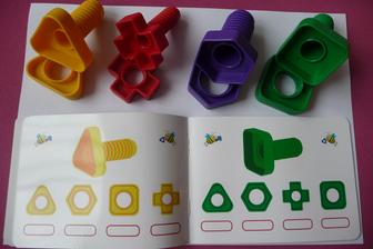 Skrutky veľké 6 cm pre malé detsské rúčky, na spoznávanie tvarov, farieb, jemnú motoriku a trénovanie pohybu rúk "šróbovanie", v e-shope rozumnehracky.sk