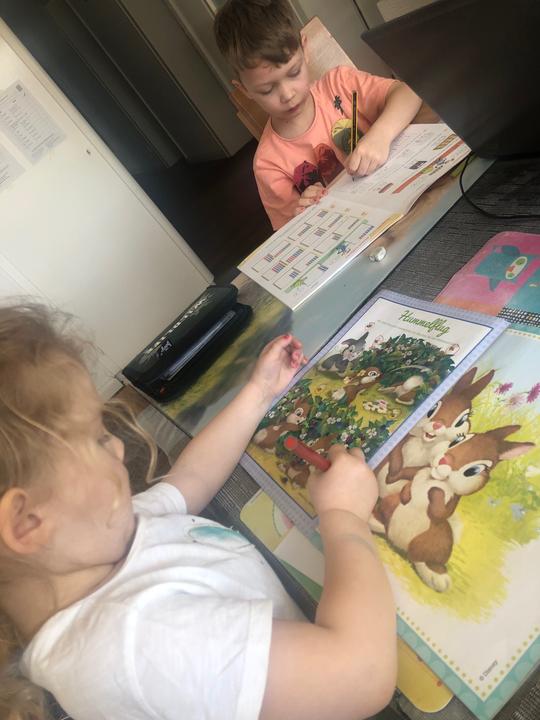 Kým staršia robí úlohu z Výtvarnej výchovy a kreslí samu seba s rúškom, mladší sa zabáva kreslením a pomáhaním pri upratovaní: