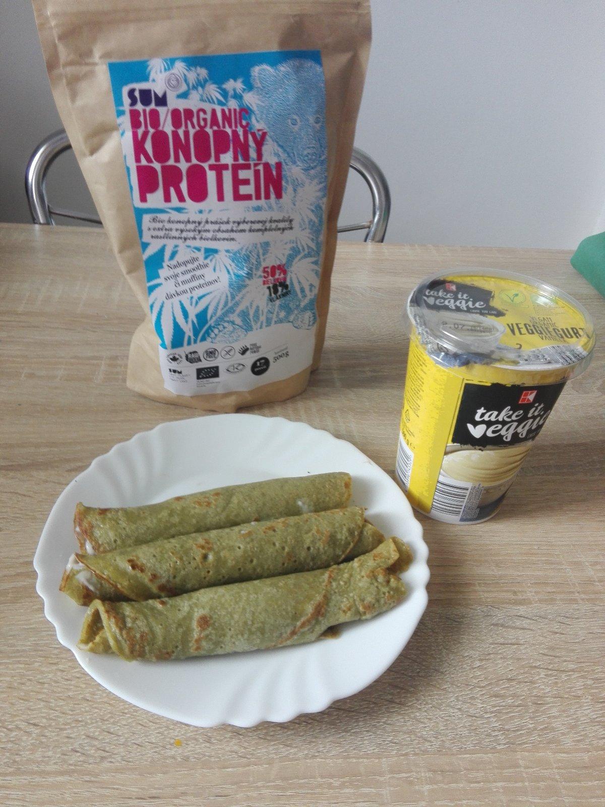 Proteinove palacinky plnene sojovym jogurtom z kauflandu: 300ml mandlove mlieko, 1-2PL konopný protein, 2PL vanilkova hraška, 150g muka, 1 PL xylitol