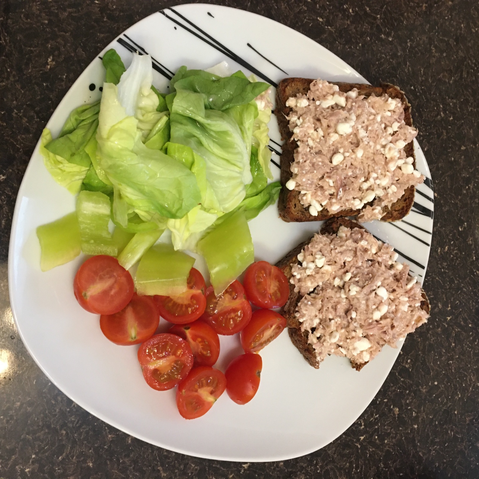 Tuniak zmiešaný s cottage a troskou olivového oleja a proteínových chlieb