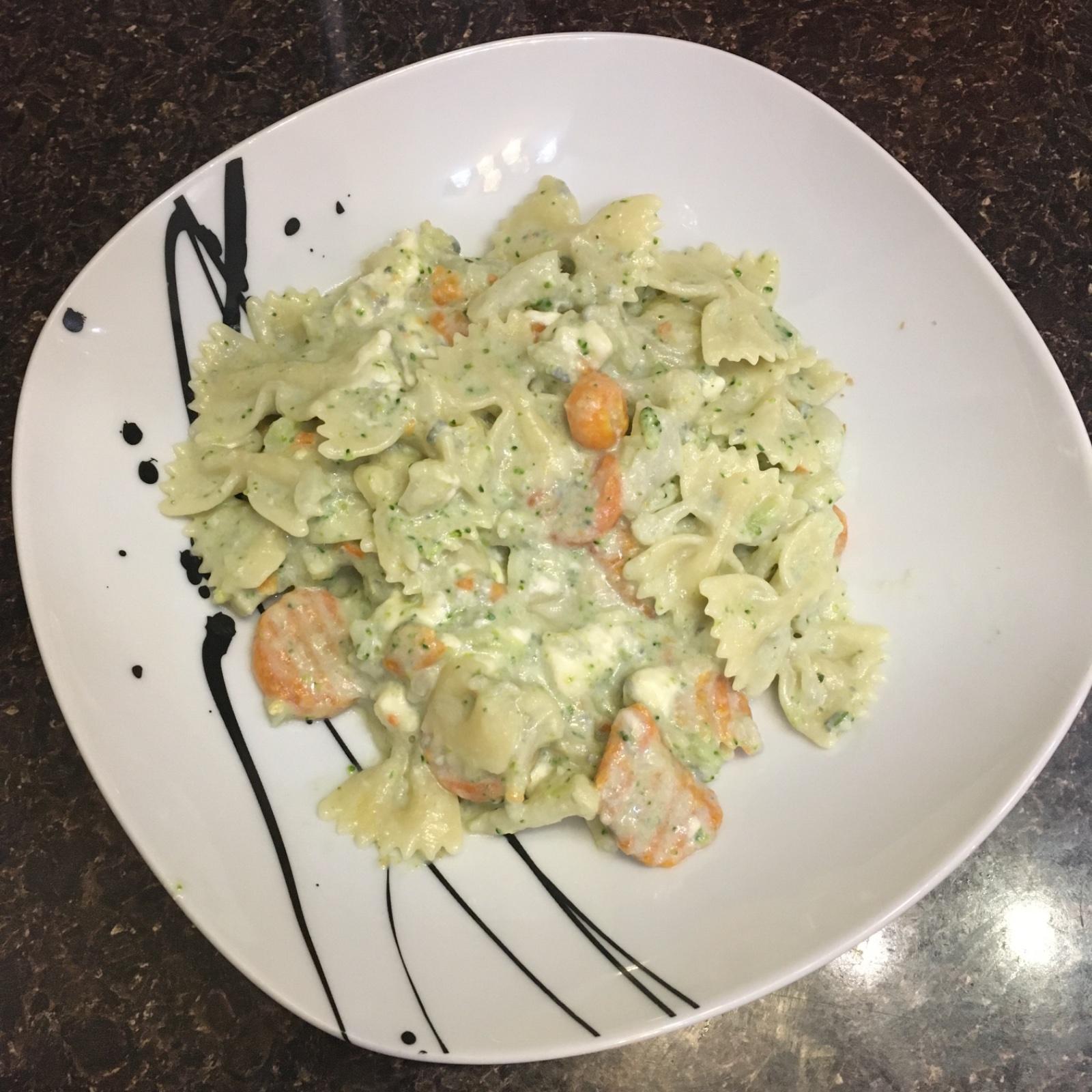 Uvarena Mrazená zelenina, do horúcej pridané maslo a niva, horúce cestoviny :)