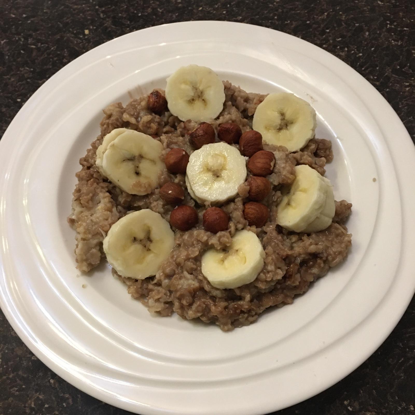 Ovsena kasa s lyžičkou proteinely,medu plus banan a lieskove orechy