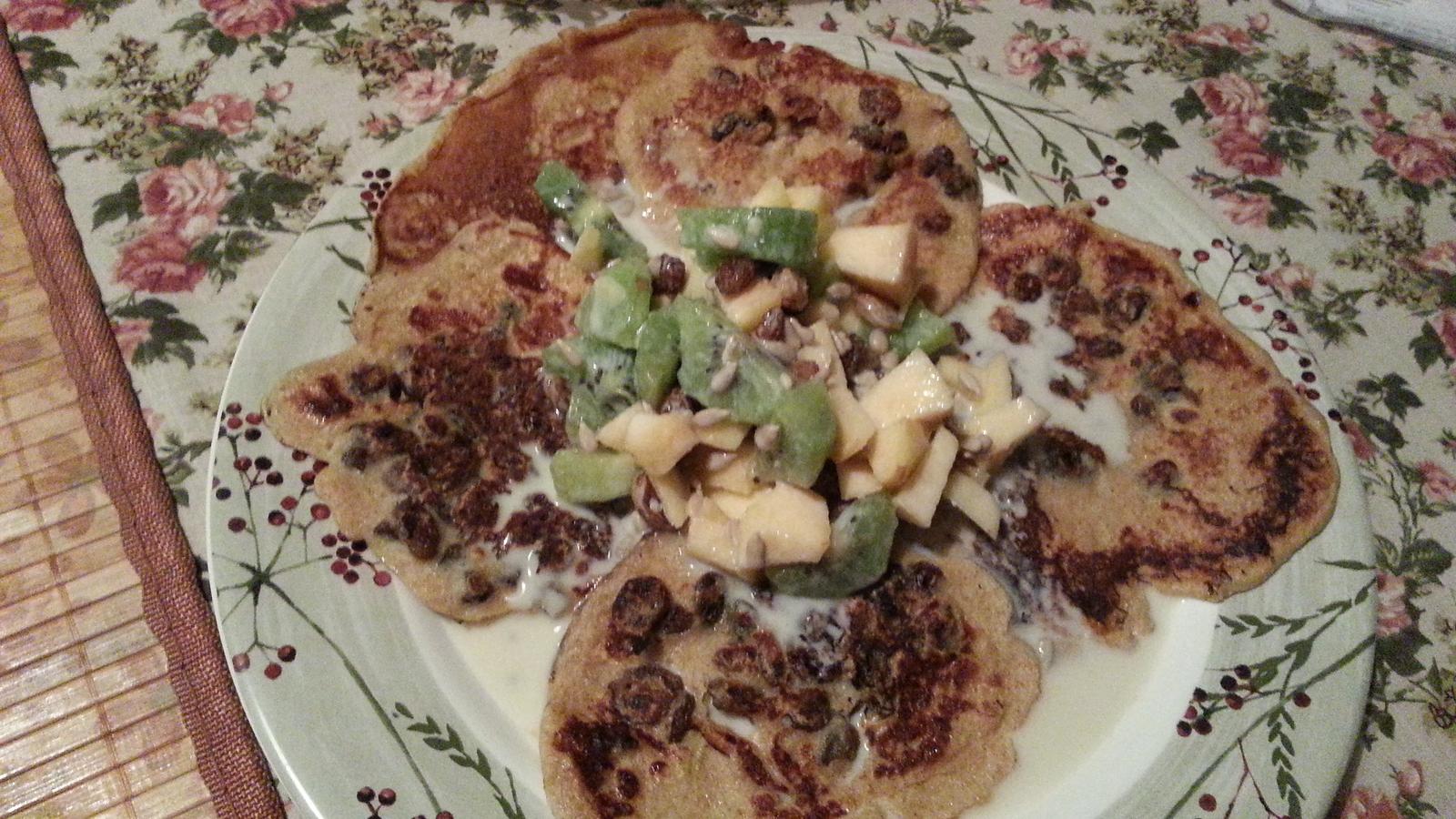 lievance zo spald.muky,vody,vajicka,hrozienok a medu.na vrchu ovocie z ranajok