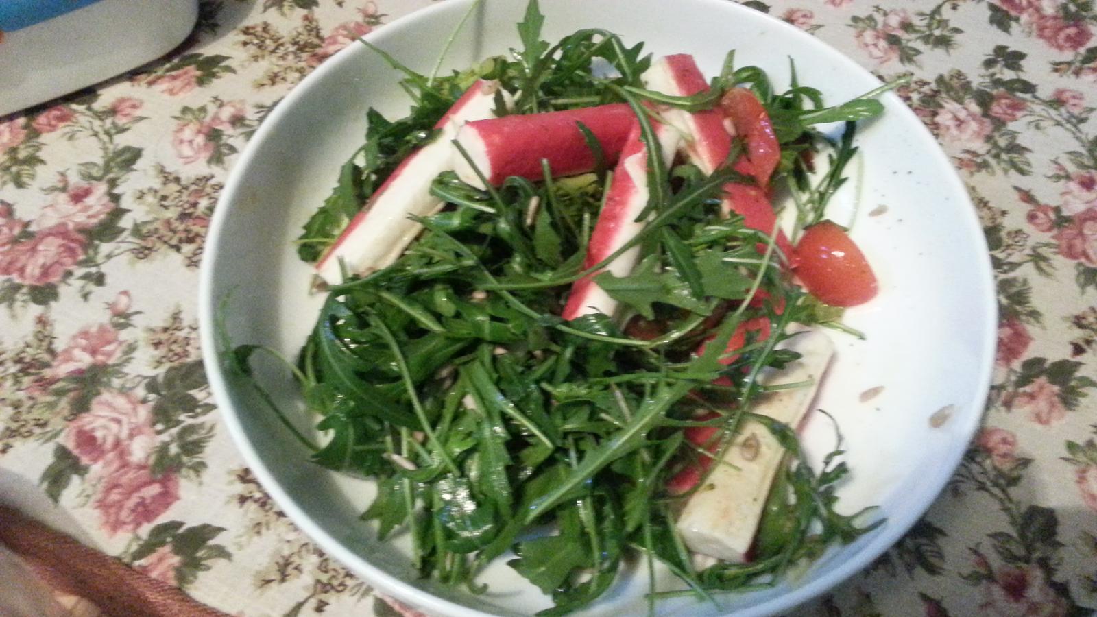 rukola,brokolica,rajcinky a rybie tycinky s citronovou stavou