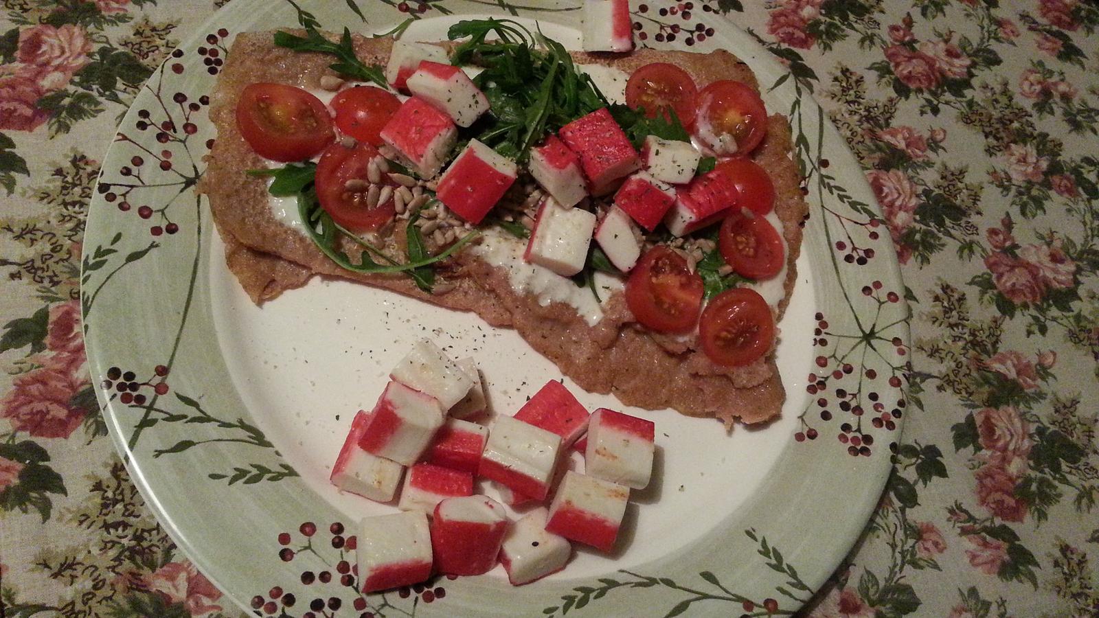 obrateny kebab...placka zo spald.muky a vody,omacka-domaci jogurt,cesnak,horcica ...rybie tycinky,rukola,rajcinky