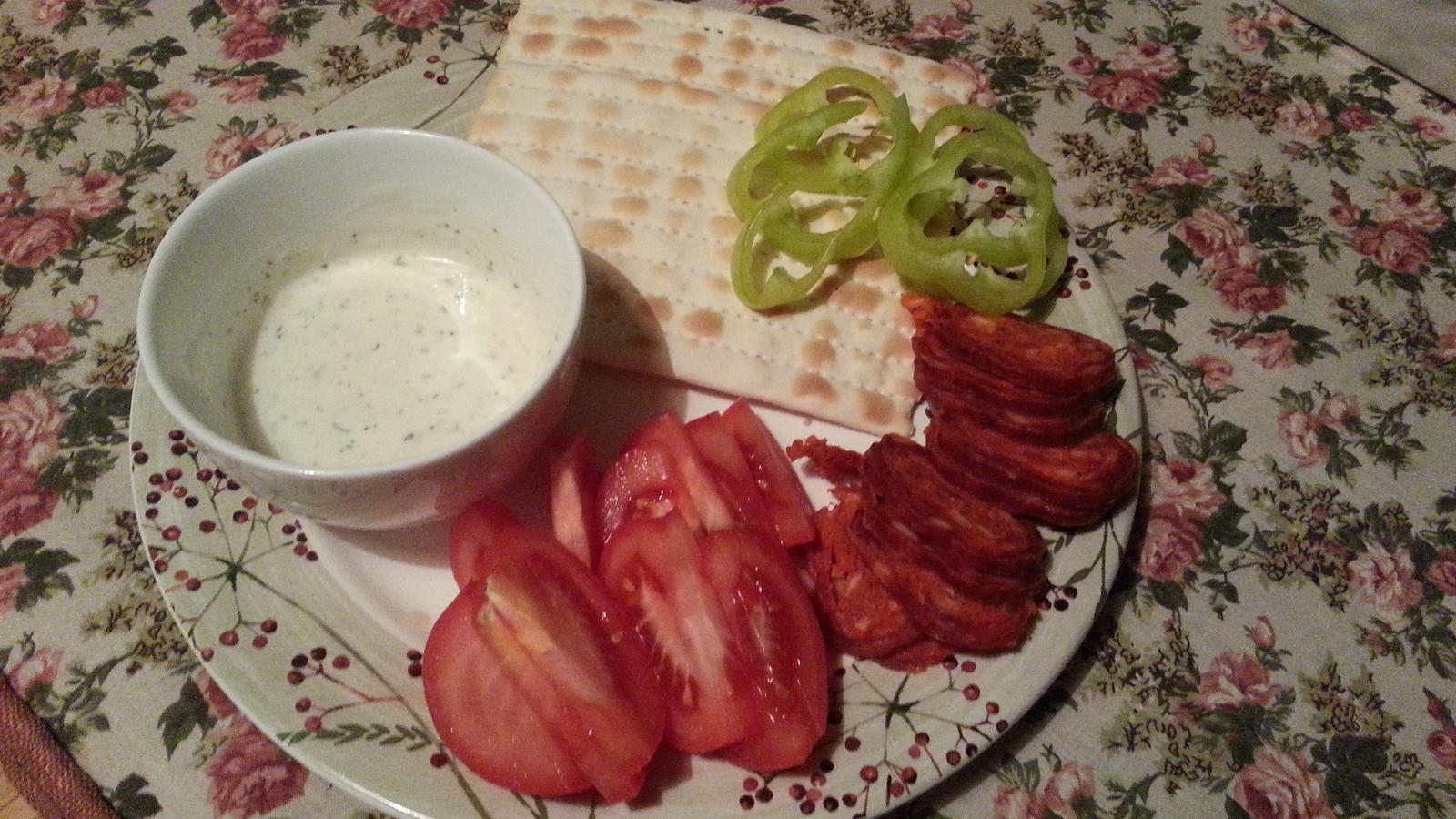 a kto povedal,ze sa nesmu klobasky?a na miesto pomazanky na maces omacka z domaceho jogurtu,cesnaku,horcice a byl.soli