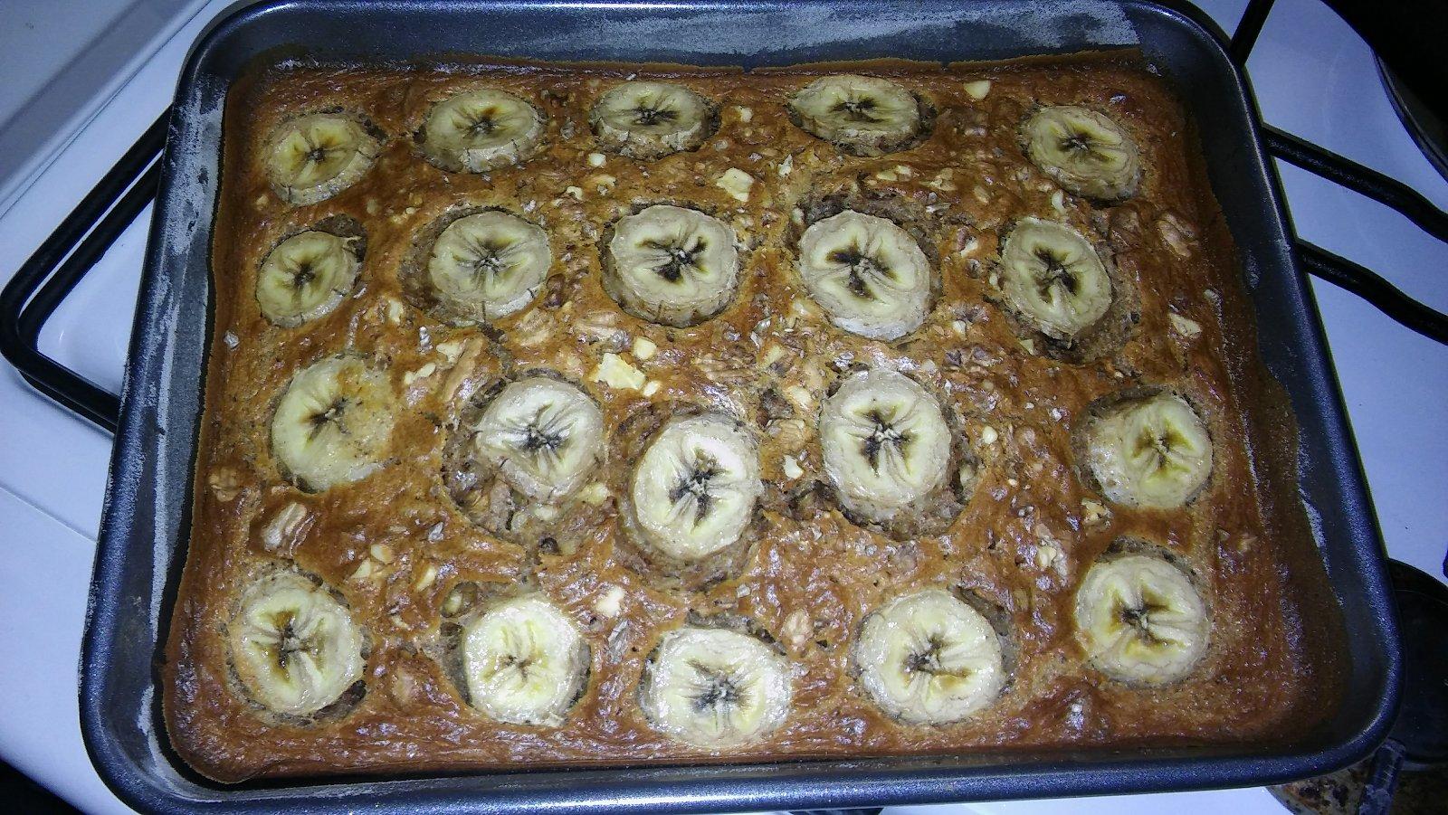 2hr.ovs.vlociek,1,5hr.mlieko,1 cl skorica-mixnut,odstat,2.cast 2 vajicka,1 banan,1cl soda bikarb.,3cl medu mixnut,spojit obe casti.na mensi plech,hore orechy,banan...180 stupn.mnam