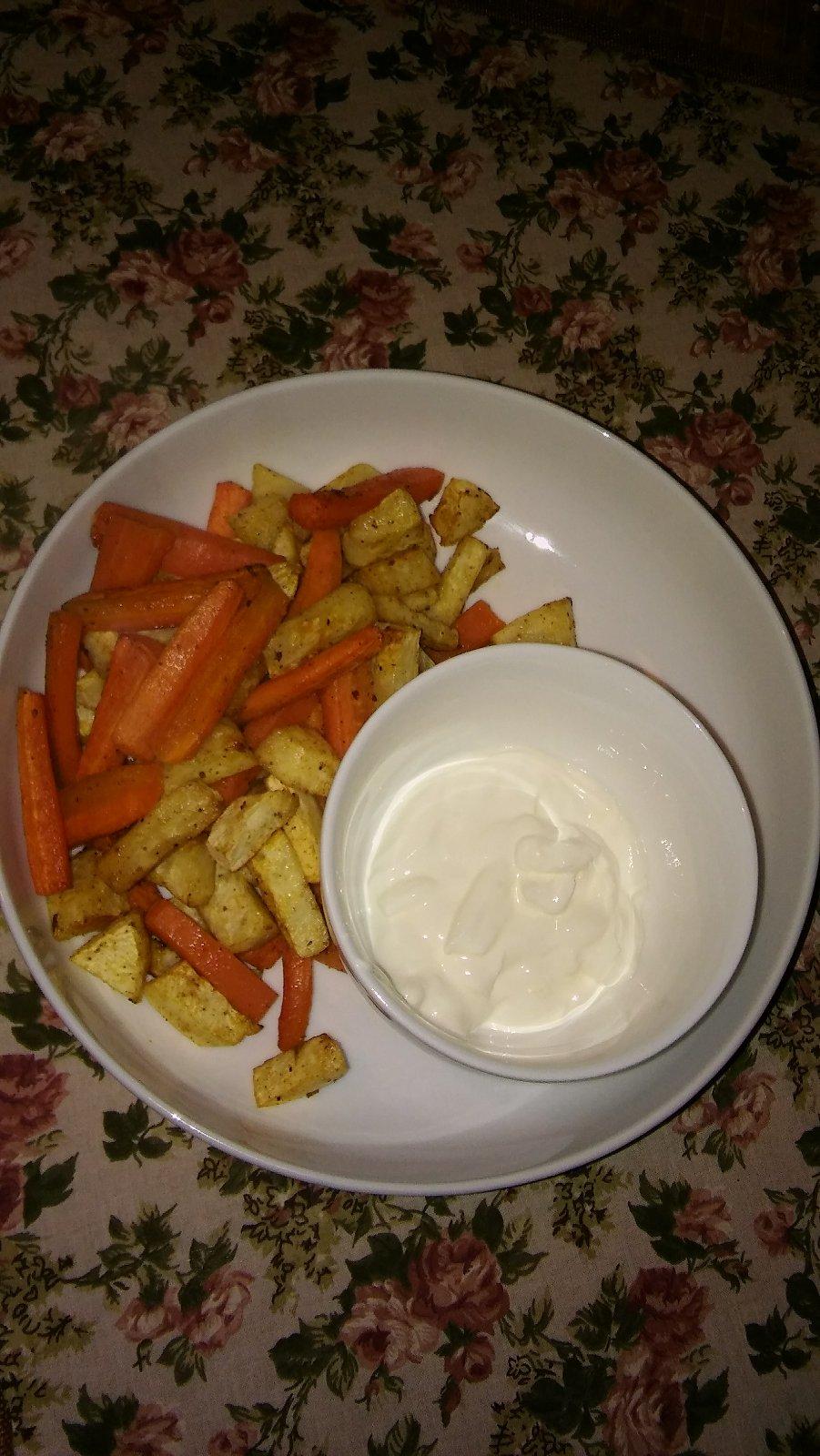hranolecky zo zeleru,mrkvicky s jogurtom s cesnakom